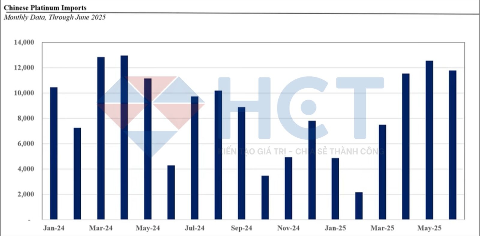 Lượng nhập khẩu bạch kim vào Trung Quốc đã tăng mạnh vào tháng 4 và tháng 5, tuy nhiên, cần xem xét bối cảnh của sự gia tăng này. Trong giai đoạn từ tháng 10 năm ngoái đến tháng 2 năm nay, nhập khẩu bạch kim vào Trung Quốc đã thấp hơn đáng kể, do đó, việc mua vào trong tháng 4 và tháng 5 có thể chủ yếu là để bổ sung hàng tồn kho sau khi nhu cầu yếu trước đó.