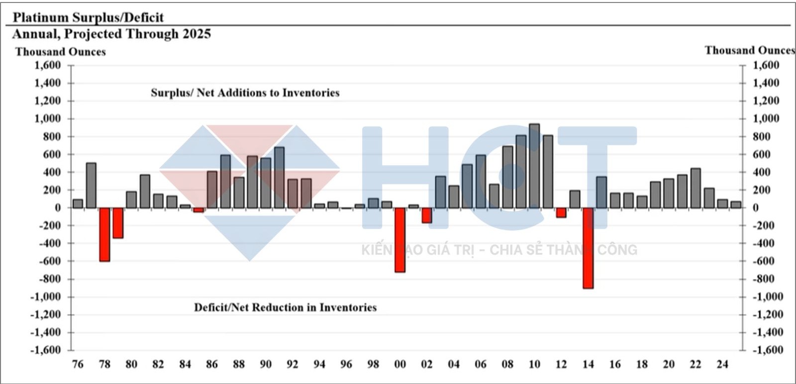 Tuy nhiên, thực tế là thị trường bạch kim không thiếu hụt mà vẫn duy trì tình trạng thặng dư, chủ yếu do sự suy giảm của cả nguồn cung bạch kim tinh chế mới và nhu cầu chế tạo. Mặc dù thặng dư giảm mạnh, giá bạch kim vẫn không tăng mạnh trong thời gian qua do sự tích tụ lớn các kho dự trữ bạch kim trên mặt đất.