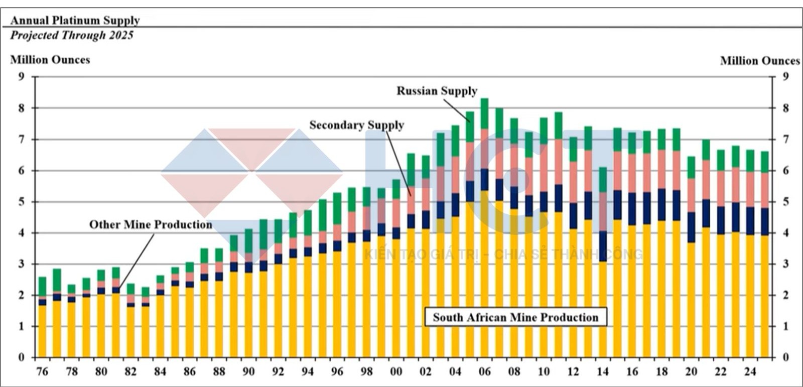 Tổng nguồn cung bạch kim đã giảm 2% trong năm 2024, xuống còn 6,7 triệu ounce, so với 6,8 triệu ounce của năm 2023. Cả nguồn cung từ mỏ và phế liệu đều giảm, với nguồn cung từ mỏ bạch kim giảm liên tục từ năm 2006, chủ yếu tại Nam Phi. Nguồn cung phế liệu bạch kim giảm mạnh 100%, do thị trường xe thương mại yếu và các vấn đề lâu dài khác trong việc tái chế bạch kim từ bộ lọc khí thải. Dự báo tổng nguồn cung bạch kim sẽ tiếp tục giảm trong năm 2025, xuống còn 6,66 triệu ounce.