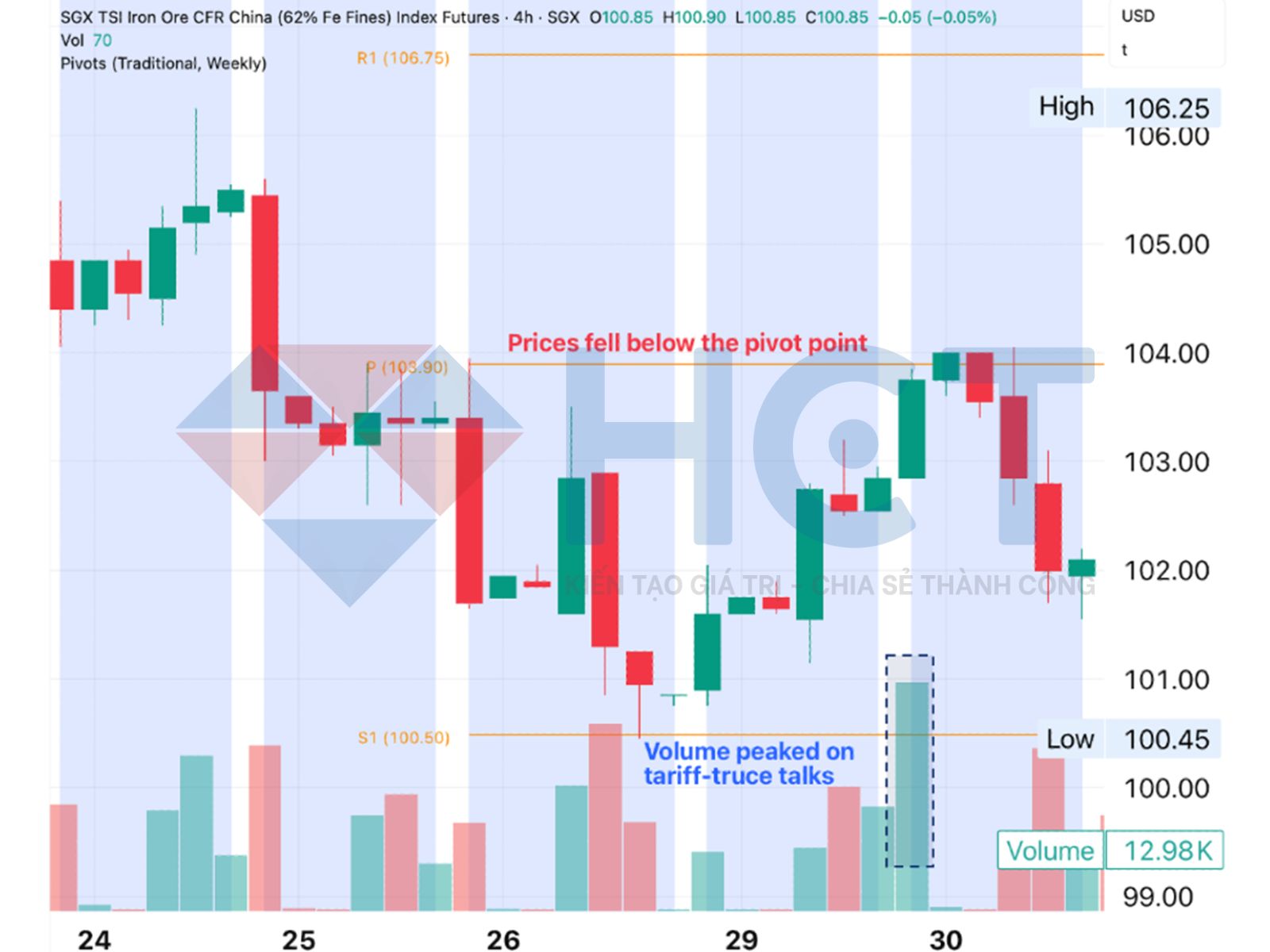 Giá quặng sắt đang giao dịch dưới các đường trung bình động ngắn hạn, phát tín hiệu tiêu cực cho xu hướng ngắn hạn