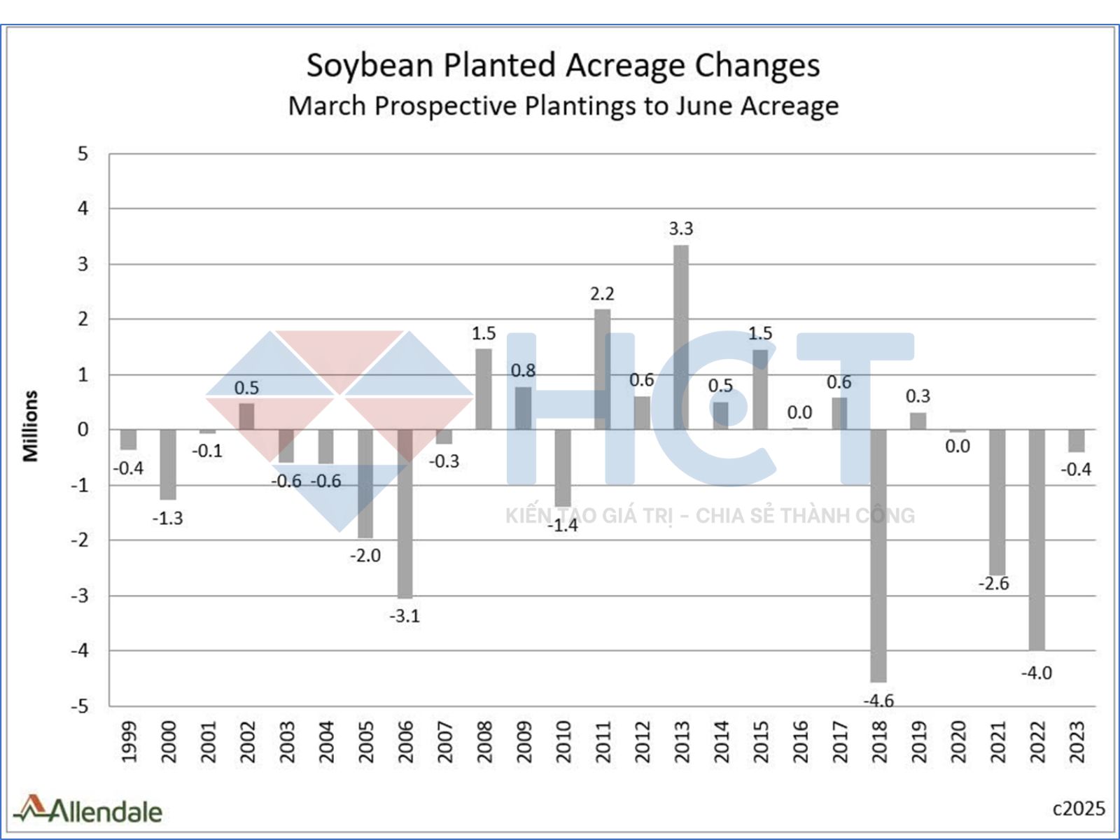 So sánh giữa số liệu diện tích đậu tương dự kiến tháng 3 và thực tế tháng 6 trong 25 năm qua