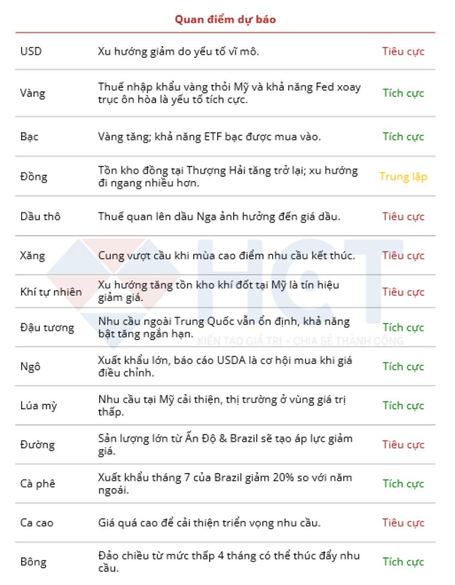 Triển vọng kinh tế vĩ mô đã xấu đi sau sự sụt giảm việc làm của Mỹ. Các chỉ số PMI châu Âu và ISM mới nhất cũng cho thấy dấu hiệu suy yếu. Mặc dù chưa quá đáng lo ngại, nhiều sản phẩm hàng hóa có khả năng sẽ chịu áp lực do lo sợ nhu cầu giảm sút. Tuy nhiên, tâm lý thị trường sẽ được hỗ trợ nhờ kỳ vọng về khả năng Fed cắt giảm lãi suất vào tháng 9 và khả năng đồng USD bước vào xu hướng giảm mới.