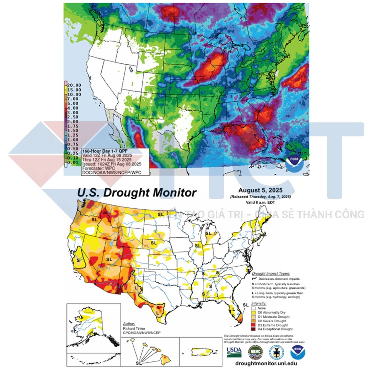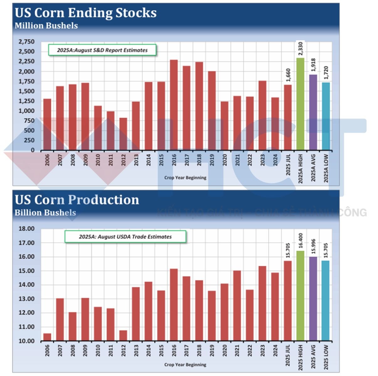 USDA có thể sẽ điều chỉnh tăng dự báo xuất khẩu cả cho vụ cũ và vụ mới, giúp giảm bớt áp lực từ phía cung. Lịch sử cho thấy USDA thường có xu hướng đánh giá cao năng suất vào tháng 8 trong những năm mùa vụ tốt. Nếu điều đó lặp lại, bất kỳ sự gia tăng nhu cầu hoặc điều chỉnh giảm nhẹ nào về sản lượng cũng có thể làm giảm tác động tiêu cực của tiêu đề báo cáo.