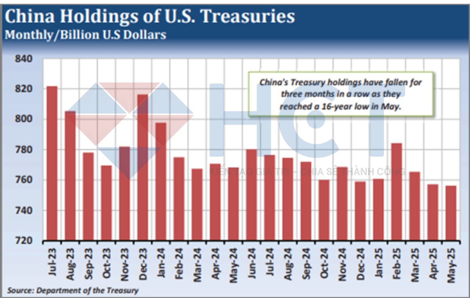 Ngoài ra, có sự khác biệt đáng kể giữa lượng nắm giữ của Nhật Bản và Trung Quốc — hai quốc gia được thị trường đặc biệt quan tâm. Nắm giữ của Nhật đạt 1,135 nghìn tỷ USD trong tháng 5, cao nhất kể từ tháng 3/2024.