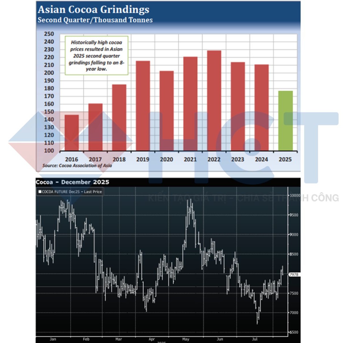 Lượng ca cao nghiền trong quý hai tại ba khu vực có nhu cầu lớn nhất thế giới (châu Âu, châu Á và Bắc Mỹ) đều thấp hơn cùng kỳ năm trước. Lượng nghiền ở Bắc Mỹ là 101.865 tấn (giảm 2,8%) và ở châu Âu là 331.762 tấn (giảm 7,2%). Lượng nghiền ở châu Á trong quý hai giảm 16,3% so với năm 2024, đạt 176.644 tấn — mức thấp nhất kể từ quý hai năm 2017. Đây có thể là con số đáng lo ngại nhất vì châu Á được coi là động lực chính cho tăng trưởng nhu cầu ca cao toàn cầu.