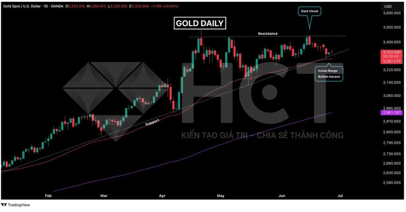 Thêm vào đó, vàng đã tăng quá mạnh trong thời gian ngắn. Tính đến ngày 25 tháng 6, giá vàng giao ngay tại London đã tăng 26.98% trong năm nay, gần bằng mức tăng của cả năm 2022. Phân tích kỹ thuật cho thấy, giá vàng gặp phải ngưỡng kháng cự mạnh ở mức 3430 USD.
