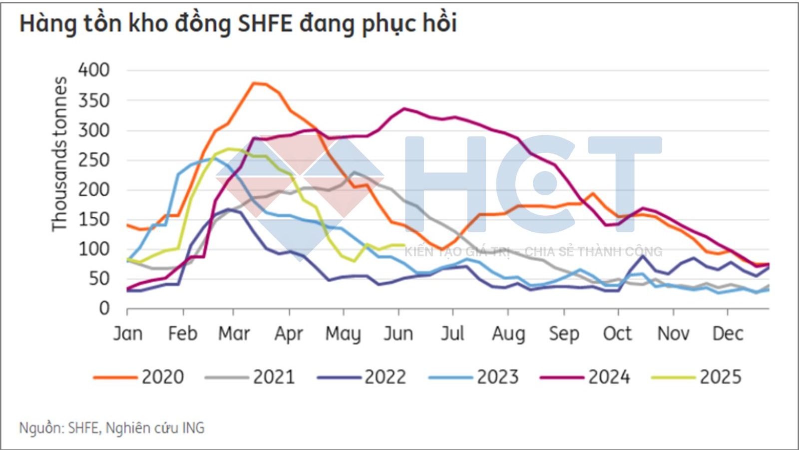 Tại Trung Quốc, tồn kho đồng trên sàn SHFE đã bật tăng trở lại lên trên 100.000 tấn, sau khi chạm mức thấp nhất kể từ 2022 trong tháng trước.