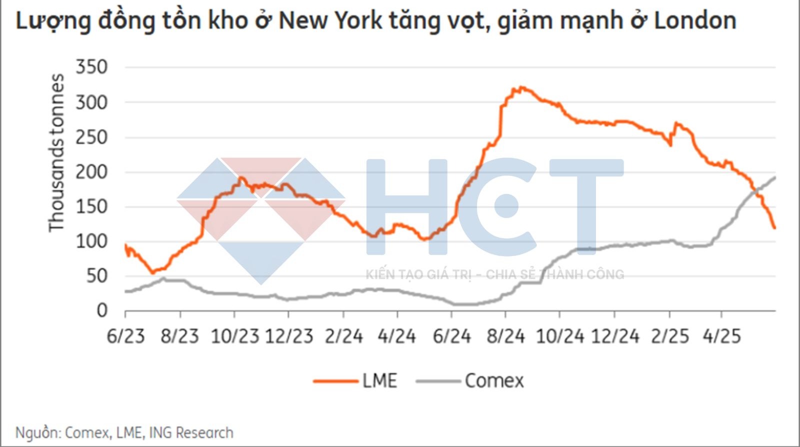 Tồn kho LME đã giảm 78% kể từ đầu năm, xuống mức thấp nhất kể từ tháng 7/2023. Ngược lại, tồn kho tại Comex (Mỹ) lại tăng vọt, đạt mức cao nhất kể từ 2018. Điều này đã đẩy chênh lệch giữa giá đồng giao ngay giá tương lai 3 tháng liên tục tăng cao, cho thấy nhu cầu giao ngay đang vượt xa lượng cung sẵn có.