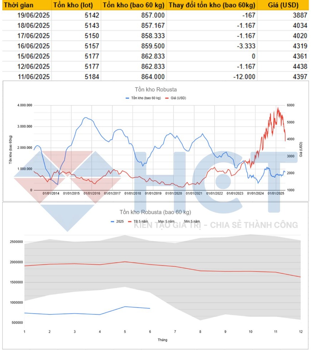 Giá Robusta không tăng theo đà giảm tồn kho cho thấy thị trường vẫn thận trọng. Sự phân hóa này có thể đến từ áp lực chốt lời sau đợt tăng mạnh tháng 5 – đầu tháng 6, lo ngại về tiêu thụ chưa phục hồi rõ nét tại các thị trường lớn, và tâm lý chờ đợi báo cáo tồn kho cuối tháng cùng số liệu giao hàng thực tế.