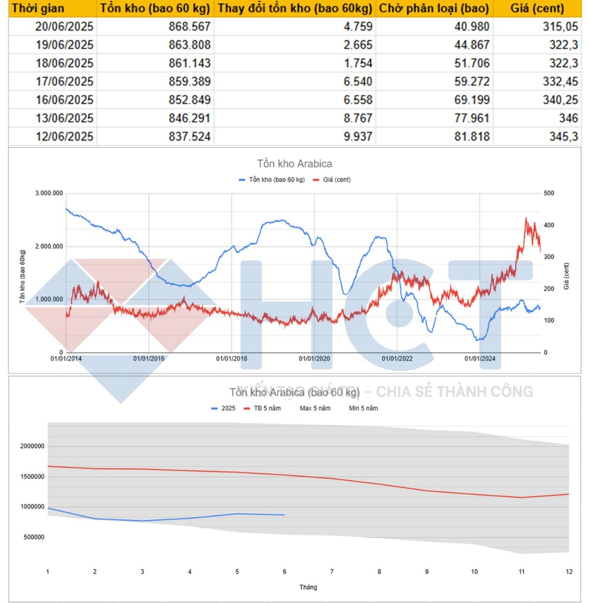Sau khi xuống đáy ngắn hạn tại mức 837.524 bao (12/06), tồn kho Arabica tại ICE đã phục hồi liên tục 4 phiên liên tiếp, chốt ngày 20/06 ở mức 868.567 bao – tăng tổng cộng hơn 31.000 bao chỉ trong chưa đầy một tuần. Đà tăng mạnh này phản ánh khả năng một phần hàng chờ phân loại đã được đưa vào kho, cho thấy chuỗi cung ứng bắt đầu có dấu hiệu khai thông.