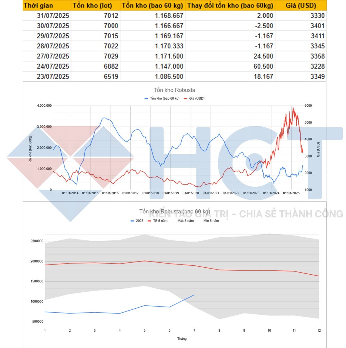 Từ 27/07 đến 31/07/2025, tồn kho Robusta biến động nhẹ nhưng nhìn chung duy trì ở mức cao, phản ánh nguồn cung vẫn ổn định sau chuỗi tăng mạnh trước đó.