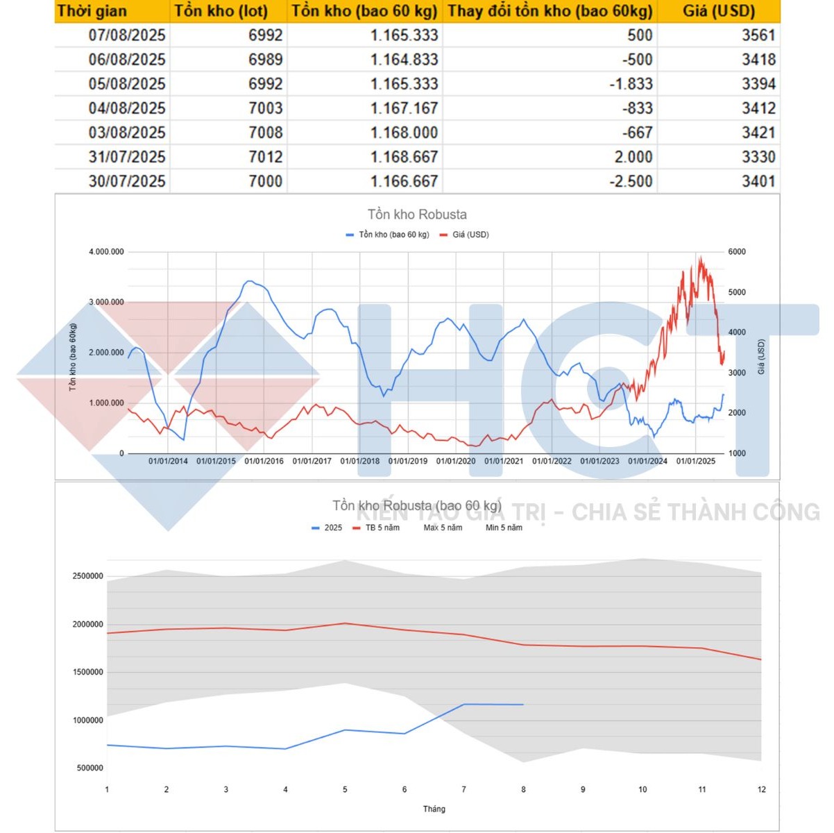 Từ 27/07 đến 31/07/2025, tồn kho Robusta biến động nhẹ nhưng nhìn chung duy trì ở mức cao, phản ánh nguồn cung vẫn ổn định sau chuỗi tăng mạnh trước đó.