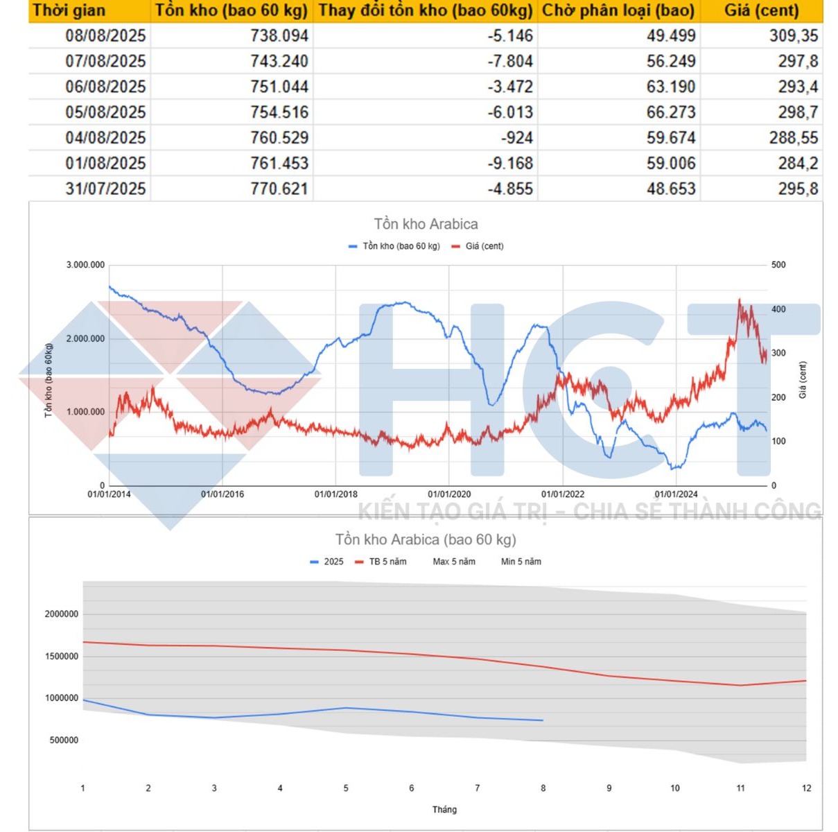 Tồn kho Arabica từ 31/07 đến 08/08/2025 giảm liên tục, cho thấy lượng hàng rút ra khỏi kho đang duy trì ở mức cao và ổn định theo hướng giảm đều: